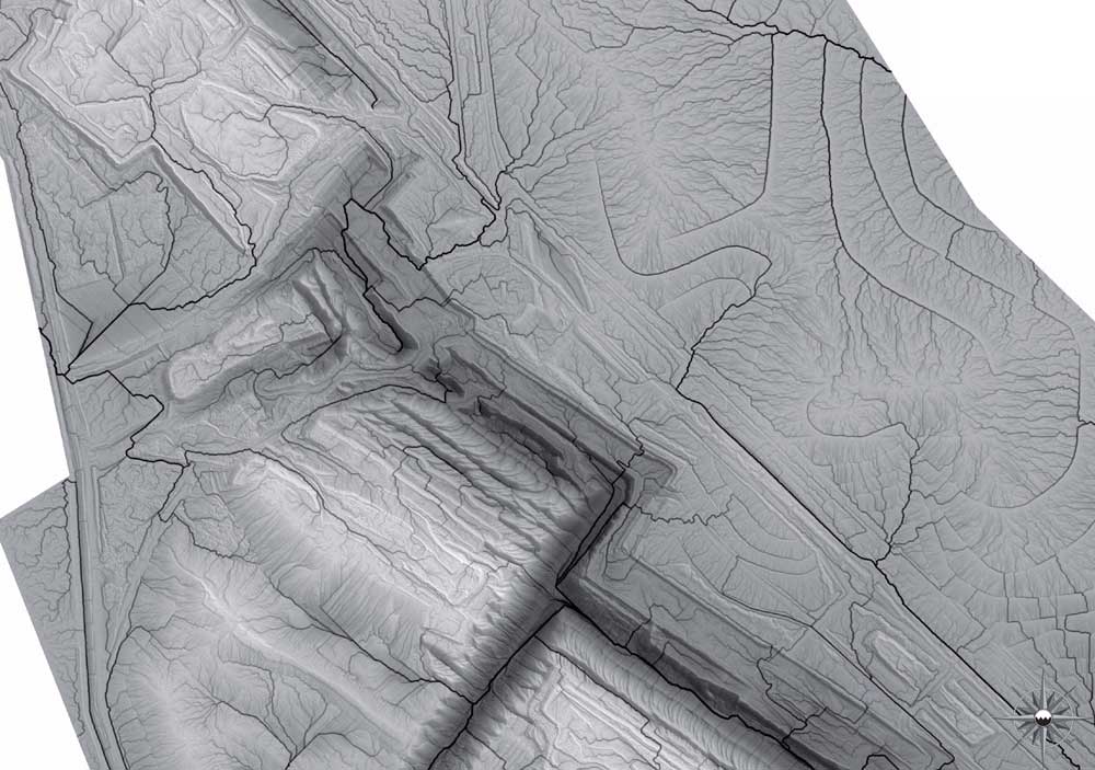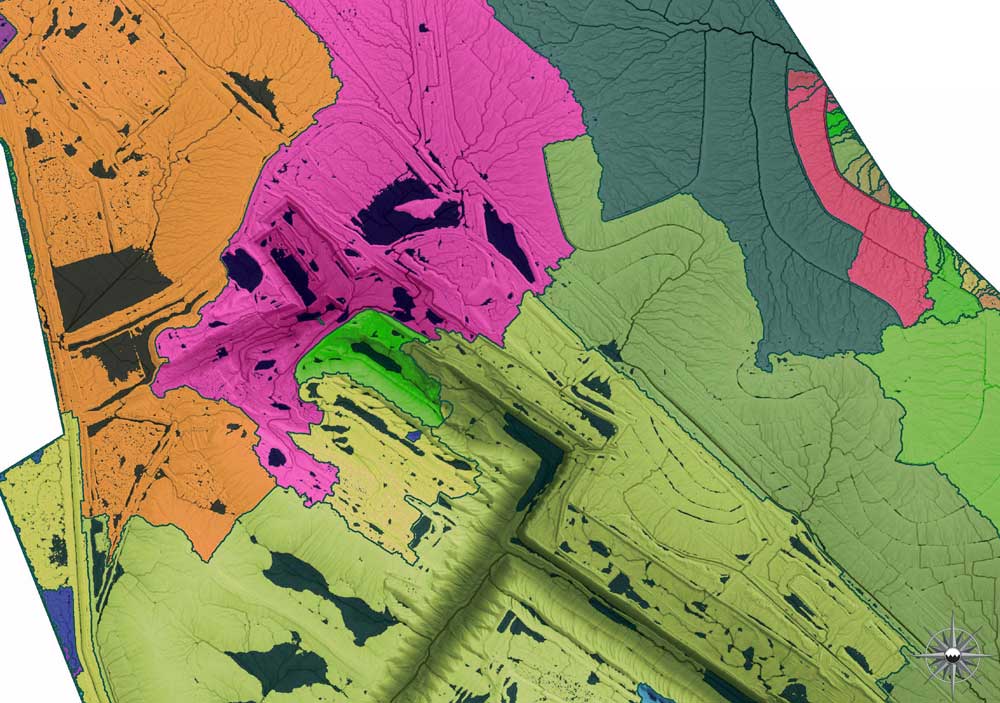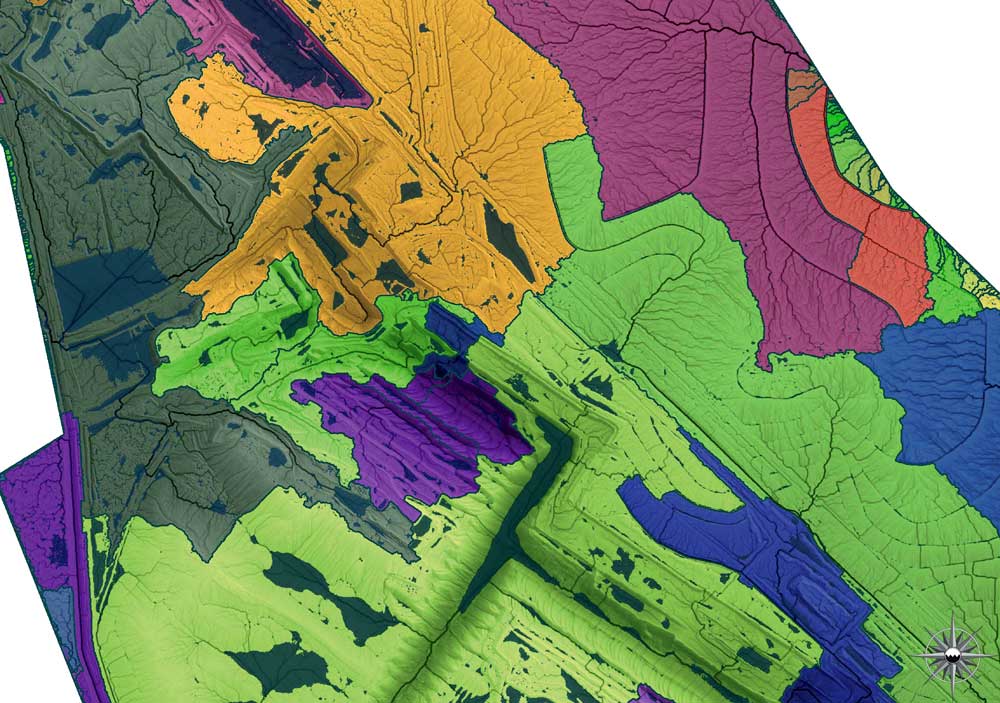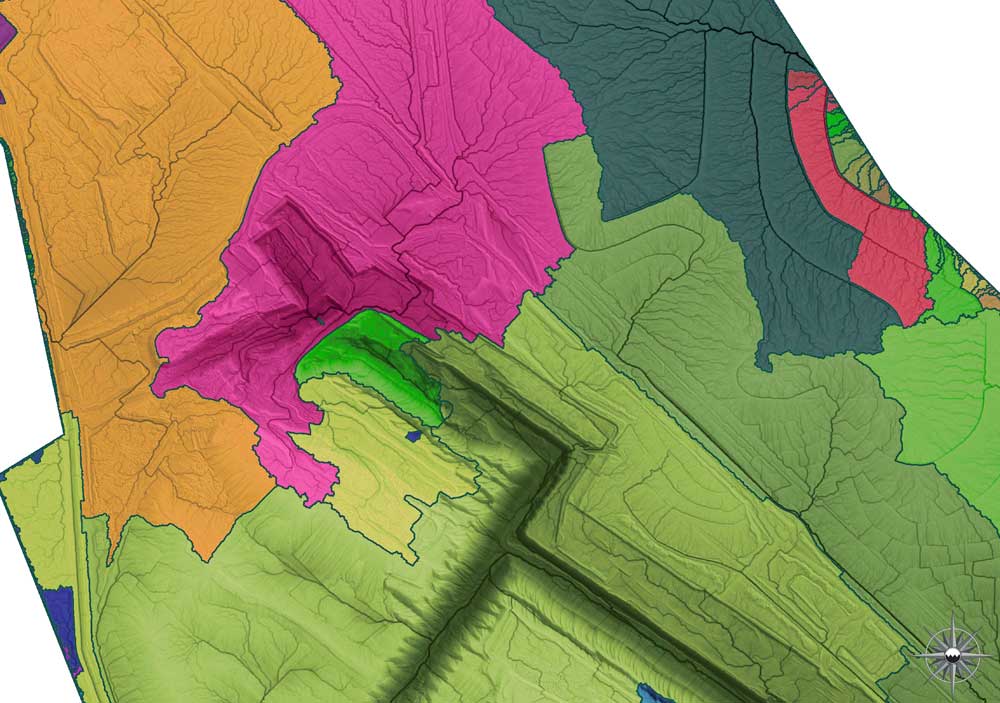 Flow paths, watersheds and ponding potential extracted from a detailed Digital Elevation Model (DEM).
